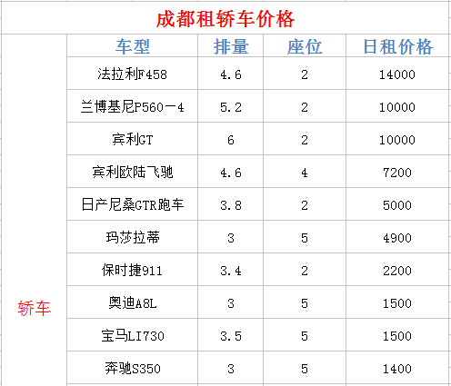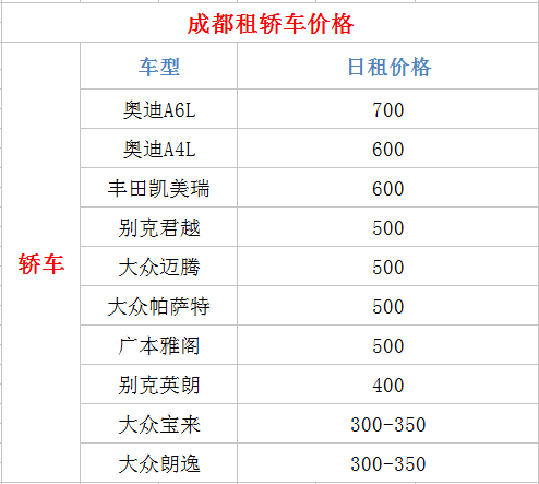 以上就是成都轎車(chē)租賃比較常見(jiàn)的幾種車(chē)型及日租價(jià)格表,僅作參考,成都租轎車(chē)價(jià)格如遇節(jié)假日,價(jià)格將上浮。反正越臨近節(jié)假日,車(chē)型越緊張,價(jià)格自然越高,如果提前預(yù)定的話,一般可以享受日常租車(chē)價(jià)格,如果租期長(zhǎng)的話,優(yōu)惠幅度更大。