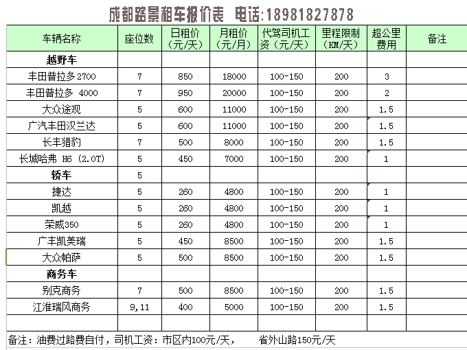 在成都租車很多人會進(jìn)行多項選擇,無論是網(wǎng)上搜索還是實(shí)體比較。在這里我們分析下選擇成都租車公司要注意的幾點(diǎn)?! 〉谝?、專業(yè)代駕 無論是哪個租車公司都配有專業(yè)的代駕司機(jī),有商務(wù)司機(jī),旅游代駕司機(jī)。商務(wù)司機(jī)則接受過專業(yè)商務(wù)禮儀培訓(xùn)。旅游代駕司機(jī)在路景租車司機(jī)隊伍里都是成都周邊和川藏老司機(jī),常年在四川省內(nèi)及川藏線上往返,駕駛技術(shù)過硬,...